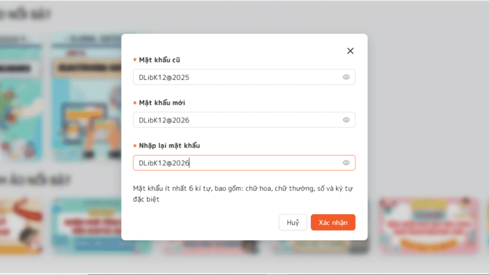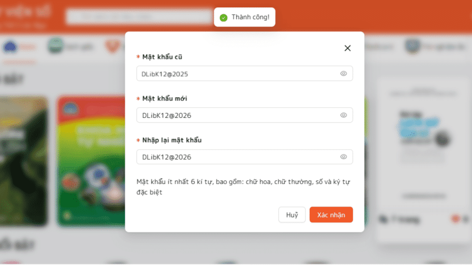 Khi hệ thống thông báo thay đổi mật khẩu thành công, thầy cô và các em đã hoàn tất quá trình. Từ lần đăng nhập tiếp theo, vui lòng sử dụng mật khẩu mới để truy cập và sử dụng tài khoản Thư viện số.