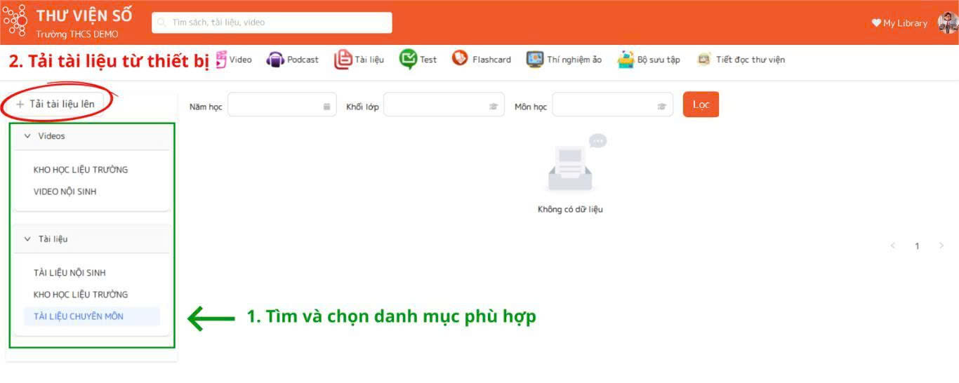 - Giáo viên chọn danh mục đã được nhà trường tạo sẵn. Nhấp vào tên danh mục phù hợp, sau đó chọn nút "Tải tài liệu lên". Thư viện số hỗ trợ thầy cô upload các loại tài liệu/video có định dạng .docx; .pdf; .pptx.