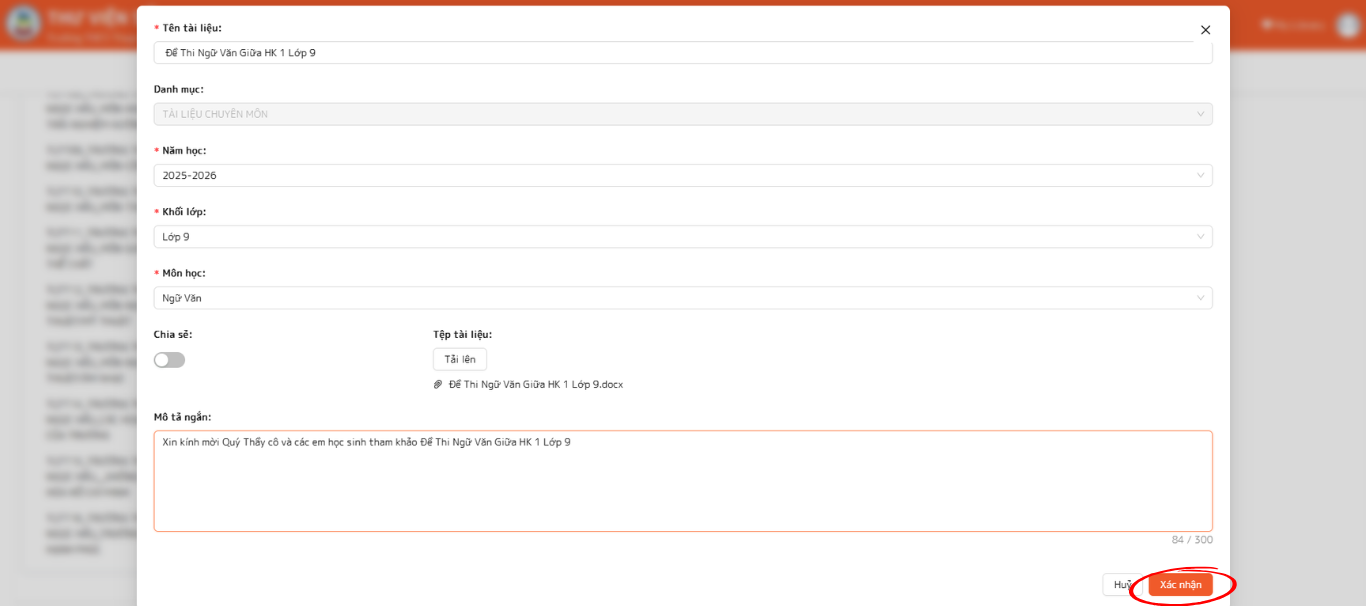 - Sau khi chọn file tài liệu/video từ thiết bị, thầy cô nhập các thông tin bắt buộc như: Tên tài liệu, Năm học, Khối lớp, Môn học. Chọn nút "Xác nhận" để hoàn tất quá trình Upload tài liệu cá nhân.