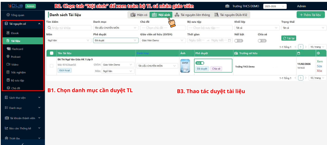 - Bước 3: Tổ trưởng chuyên môn duyệt tài liệu nội sinh.