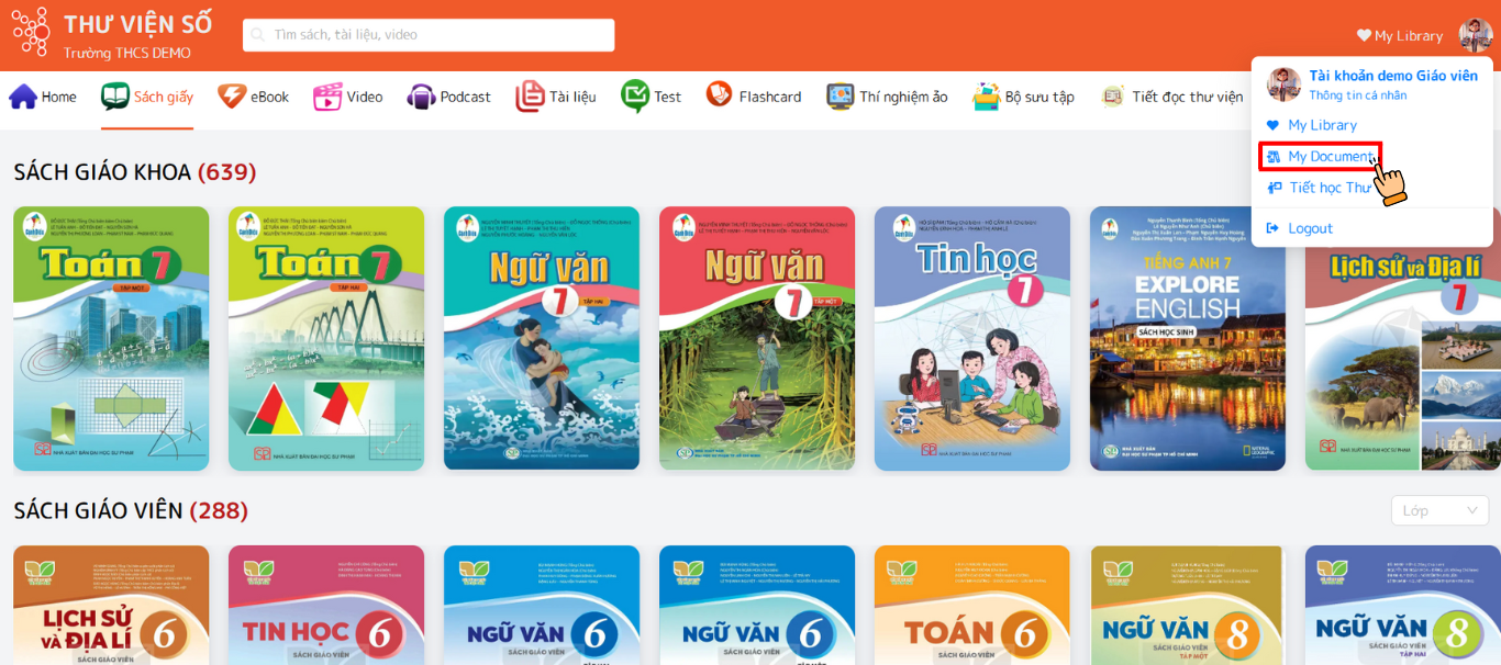 - Sau khi đăng nhập vào Thư viện số, giáo viên truy cập mục "Thông tin cá nhân", chọn mục "My Document".