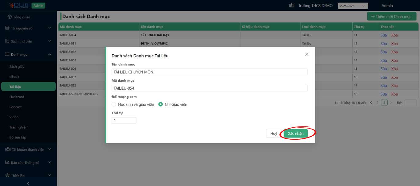 Thầy cô nhập tên danh mục (ví dụ: TÀI LIỆU CHUYÊN MÔN), chọn đối tượng xem tài liệu, điều chỉnh số thứ tự danh mục. Sau đó, nhấn nút "Xác nhận" để hoàn tất.
