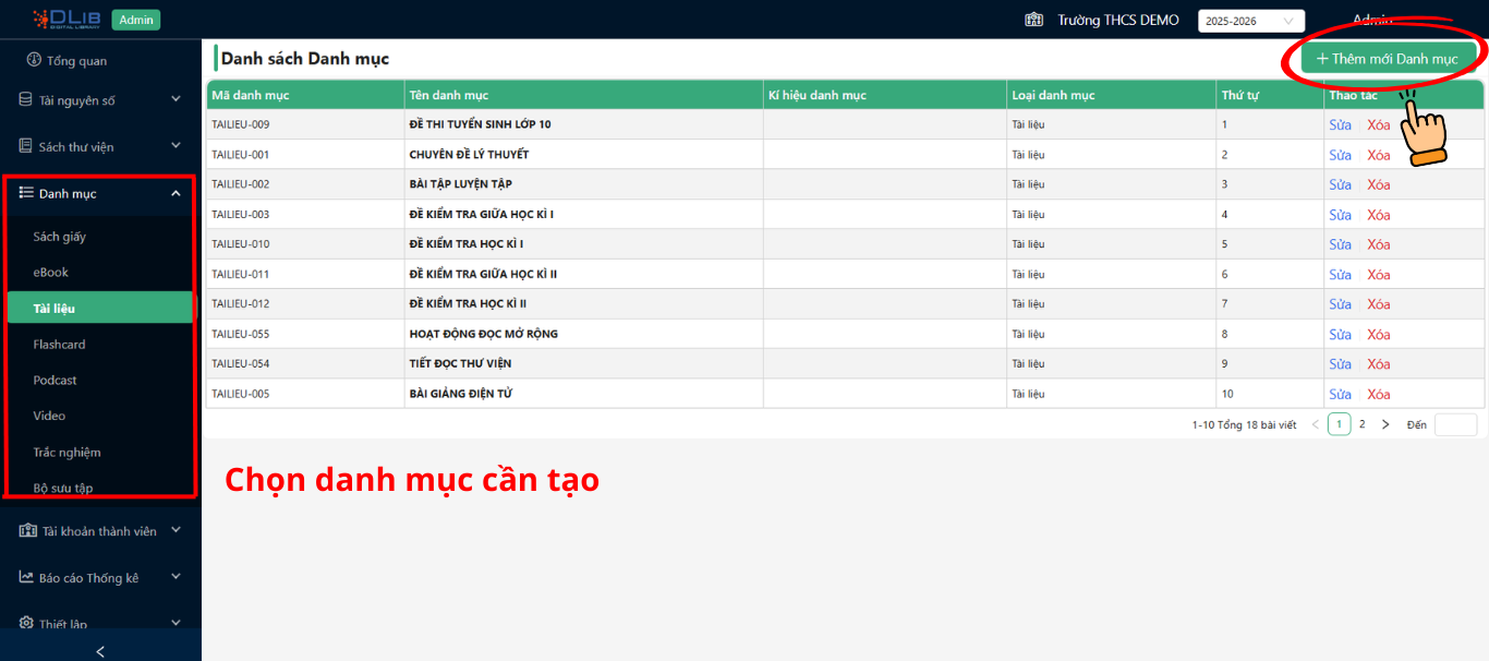 Thầy cô đăng nhập vào Trang quản lí Thư viện số (CMS). Chọn "Danh mục", chọn "Tài liệu" hoặc "Video". Sau đó, chọn nút "Thêm mới Danh mục".
