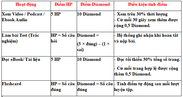 - Số điểm HP và Diamond nhận được cho từng hoạt động