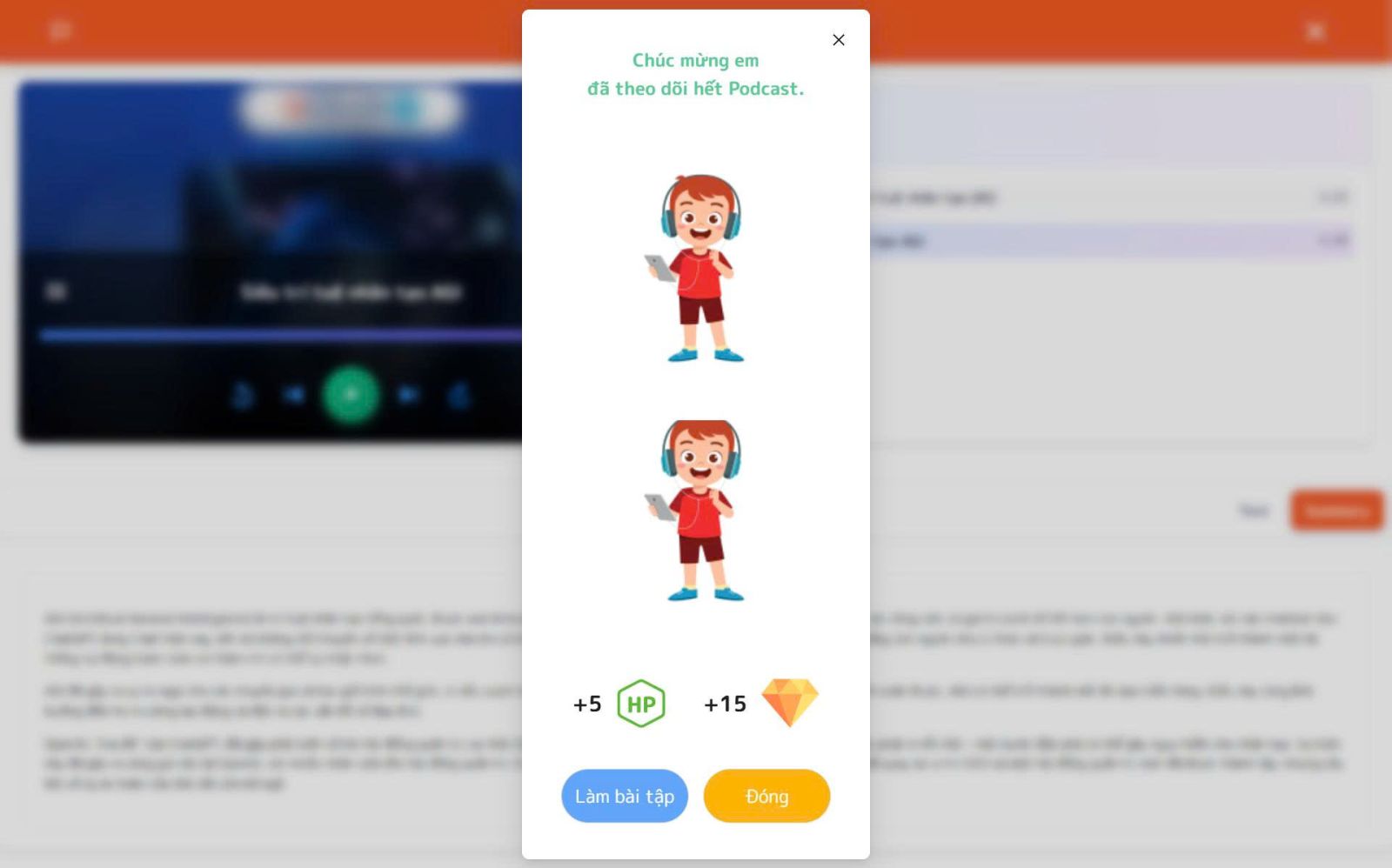Hoặc sau khi hoàn thành bài podcast, điểm số sẽ tự động hiển thị trực tiếp trên màn hình:
