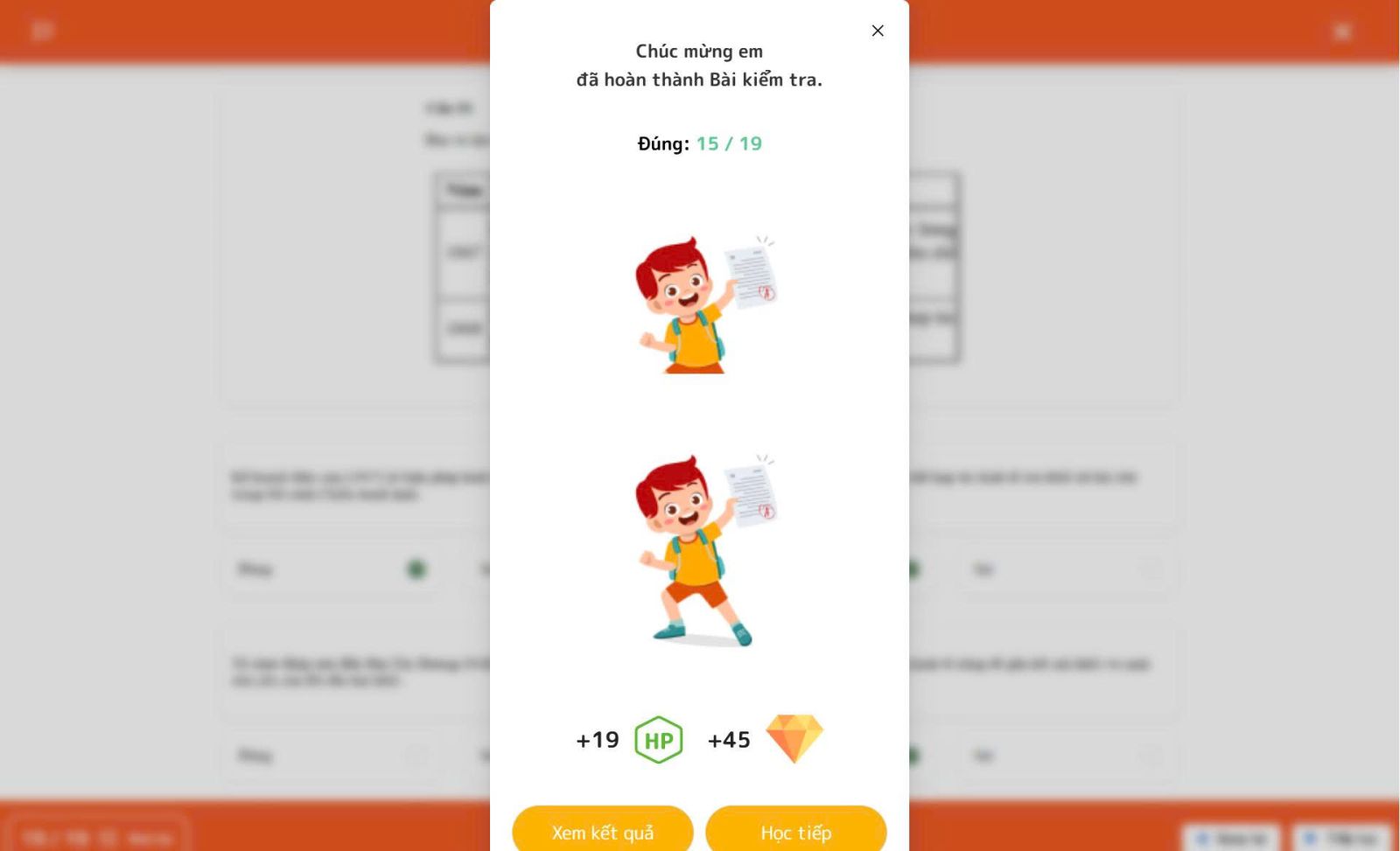 Ví dụ: Điểm HP và Diamond được tích ngay khi các em hoàn thành bài kiểm tra: