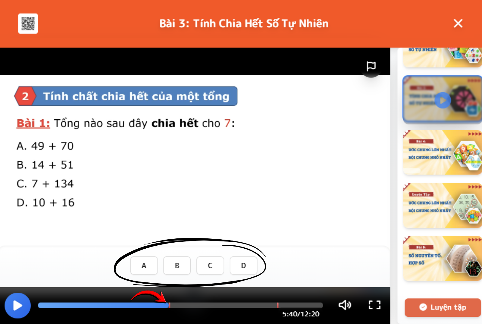 - Bước 4: Trong mỗi video đều sẽ tích hợp các câu hỏi trắc nghiệm buộc các bạn sẽ phải chọn đáp án để có thể tiếp tục xem video. Sau khi xem hết video, sẽ có phần luyện tập giúp ôn lại nội dung đã xem.
